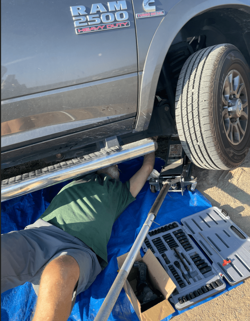 The problem is with the 4×4 Front Axle Locker Actuator. Rough roads can cause it to fail (thank you I-20). Jim went to the Dodge dealer in Tyler and found out that they would charge $800 for this strange-looking but clearly essential part, so he got online and ordered two (in case it happens again) for $80 (each) instead. He installed it himself.