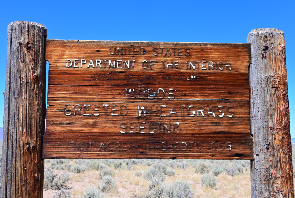 We stopped along the way at a rest stop. No restrooms, just a couple of picnic tables under cover. Jim was curious about a weather-worn sign there: “United States Department of the Interior, Bureau of Land Management, Woods Crested Wheatgrass Seeding, 1300 Acres Seeded 1955”. That’s kind of interesting.